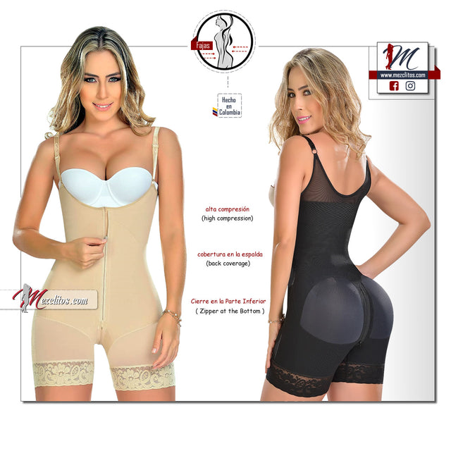 This mid thigh body shaper is ideal for daily and post-surgical use thanks to its comfort, safety, and design. High back coverage. Wearable with any dress. Abdominal reinforcement. It can be used with a bra. Adjustable straps. Buttocks natural enhancement. Zipper in front and on the bottom.t has a silicone lace on the leg that prevents it from rolling up.